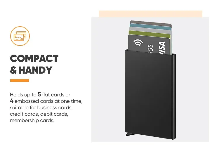 تجمع بين الأمان والخصوصية بفضل تصميم يحمي بياناتك، مع خامة معدنية قوية تمنحها متانة وأناقة في نفس الوقت. خيار مثالي للي يدور على تنظيم، حماية، وشكل عصري في محفظة وحدة.